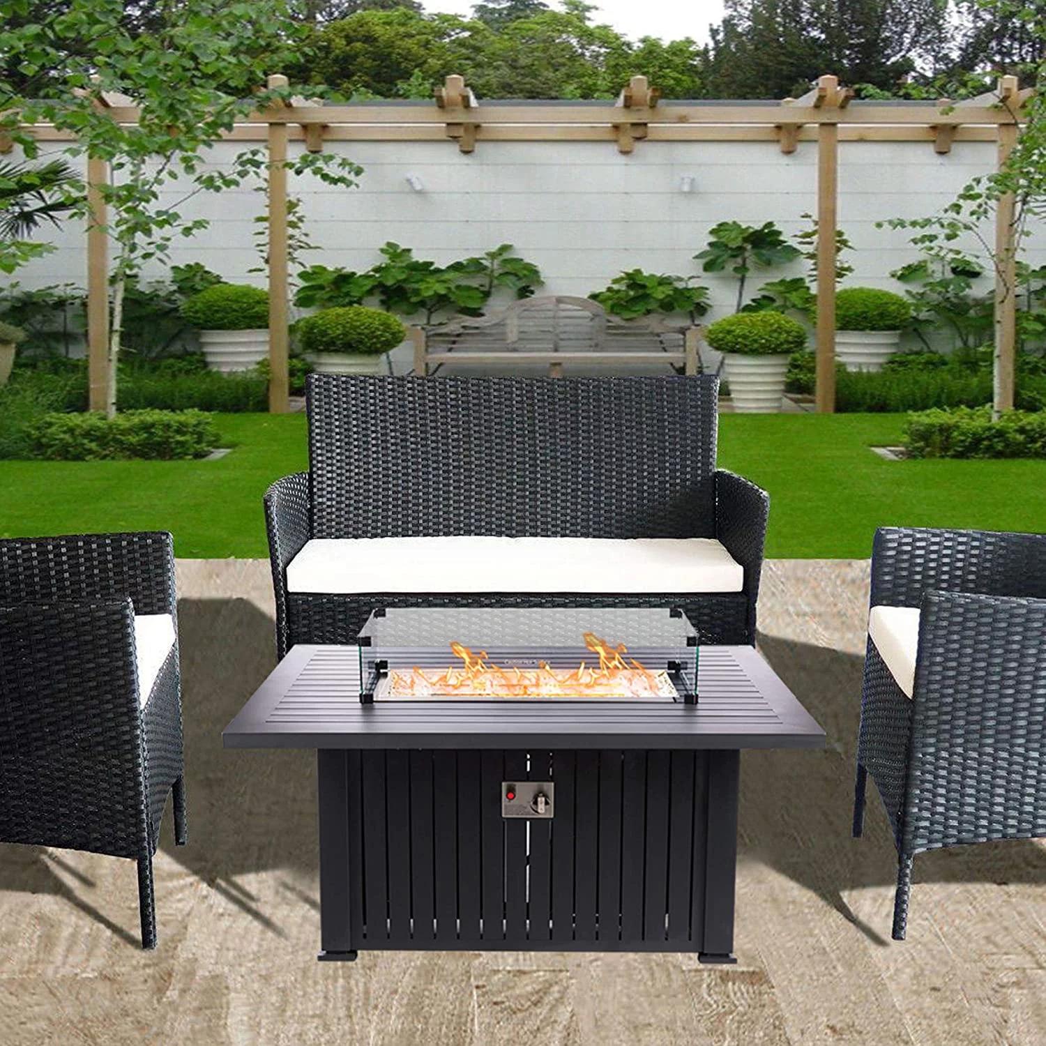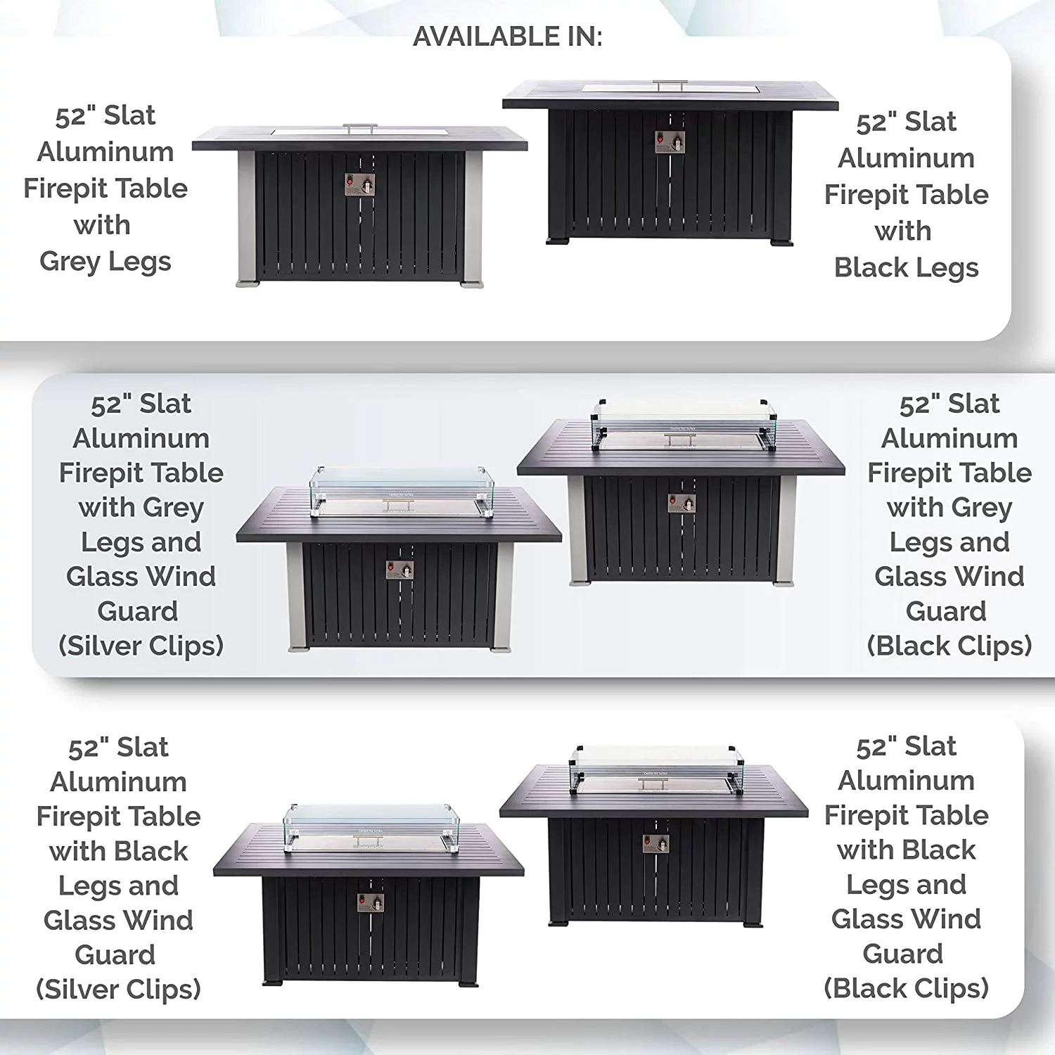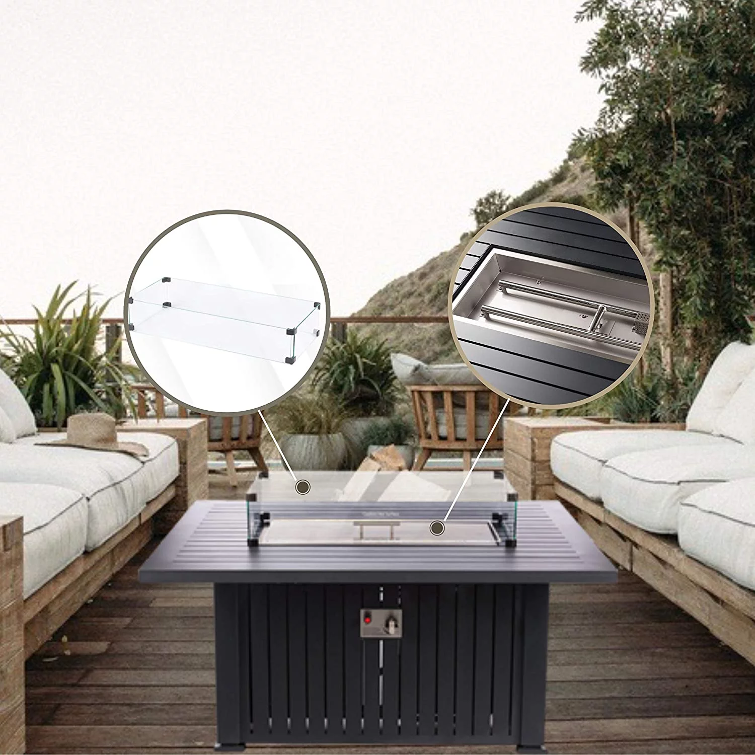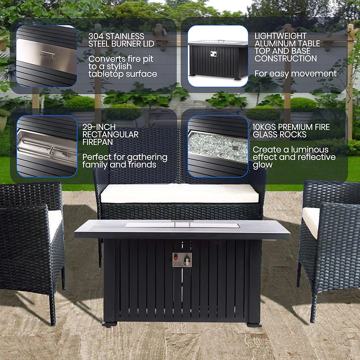 GREAT VALUE FOR A PREMIUM HIGH QUALITY, EASY TO ASSEMBLE FIRE PIT - Great value for a luxury brand outdoor firepit table with all the accessories you need. This rectangular fire table is made with a lightweight aluminum body with a stainless steel top. Not only it comes with premium 10kgs of fire glass rocks instead of lava rocks like others on the market, but it also includes UV and water-resistant cover and the fire pit cover top to turn this fire pit into a pool table and fire pit table. PUSH BUTTON IGNITION AND HIDDEN TANK STORAGE - Designed for use with any standard 20lb propane tanks, our products feature easy-access side panel construction to allow for fast and easy recharging of the tank. Long-lasting electrical ignition. Light your table quickly and safely with the simple press of a button. Our ignition switches are rated for over 100,000 ignitions. It includes an LP regulator and a 4-foot hose with safety shut off valve feature. PATIO HEATER OR OUTDOOR HEATERS CONVERSATION PIECE - Our high precision gas flame control valve makes it easy to adjust the size of your flame with the turn of a knob. Whether you are looking to warm up by the fireside, or just want to create a glowing ambiance. It has never been easier to get the right flame with this propane fire pit. Its powder-coated finish features vertical black slats and black legs that create a modern two-tone effect. 10KGS FIRE GLASS ROCKS, TEMPERED WIND GLASS GUARD, AND WATER RESISTANT COVER INCLUDED - Protect your firepits for outside rain or shine with the included 400D durable and wear-resistant custom cover. When in use, enjoy the cozy glow of the flames as it shines through the 10kgs of crystal clear fire glass rocks reflected through the 3 1/4-thick of tempered glass wind guard with black clips. SAFETY AND FUNCTIONALITY - Our 55,000 BTU stainless steel burners are CSA APPROVED and exceed the highest level of safety standards, providing a stable, smokeless flame for hours on end. Featuring high-quality stainless steel and aluminum construction, the fire table comes fully assembled and ready for use. This table also comes with a stainless steel burner cover to quickly and easily convert your fire table into a convenient, sturdy, and all-around eye-catching patio table.